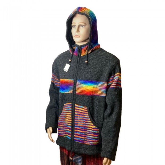 This jacket stands out with its vibrant rainbow-striped design across the chest, hood, and pockets ,a touch of Nepali artistry that makes every piece unique. The zip-up front, hood with drawstrings, and handcrafted details make it ideal for both casual wear and outdoor adventures.