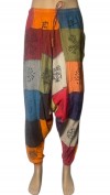 Add a touch of color and comfort to your wardrobe with these handmade multicolor patchwork yoga pants. Ethically crafted in Nepal from 100% cotton, they feature vibrant fabric patches printed with spiritual symbols — perfect for yoga and meditation.