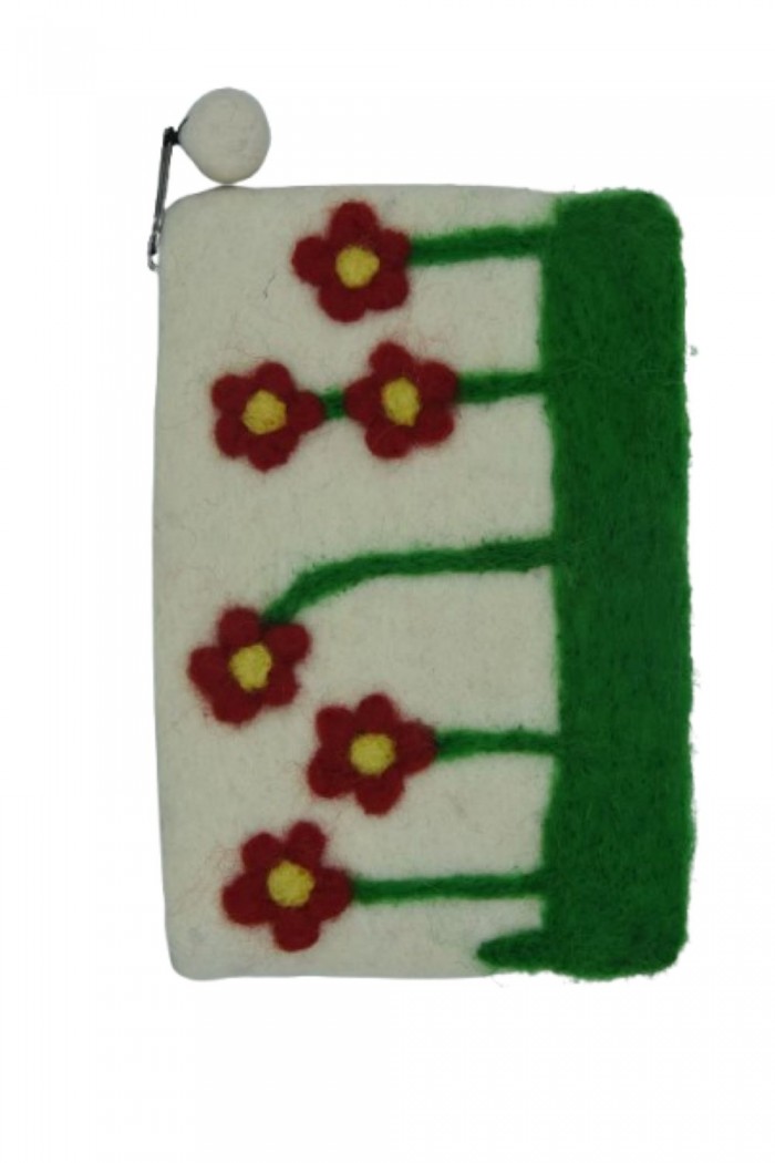 Expertly crafted by skilled artisans in Nepal, this purse is made from 100% pure wool felt using traditional felting techniques. The lovely red and yellow floral design on a soft white background with green accents adds a cheerful handmade touch to your daily essentials.