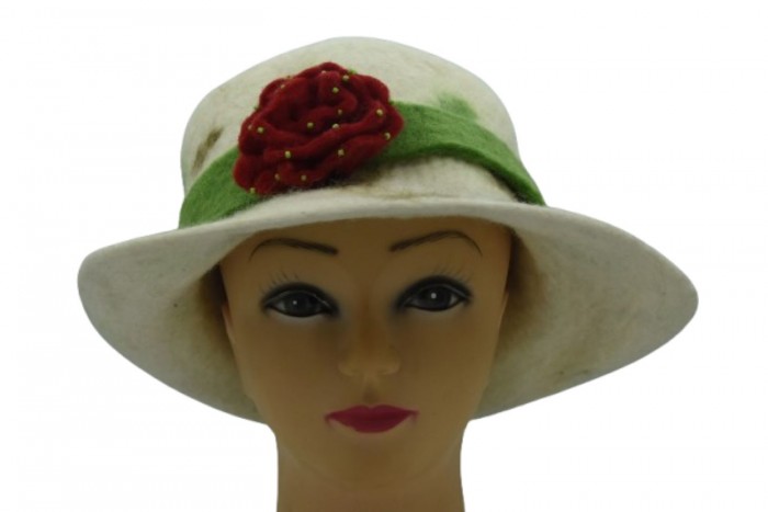 Handmade Felt Hat with Red Rose -White and Green Wool Felt Hat