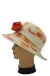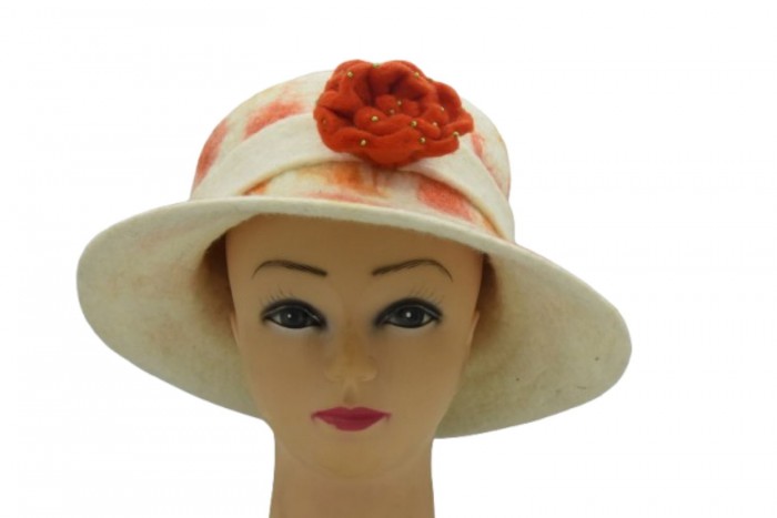 This Handmade Felt Hat combines artisan craftsmanship and natural materials for an effortlessly elegant look. Crafted from 100% wool felt, it features a soft white base with subtle red-orange patterns and a handmade red felt rose, giving it a vibrant yet refined finish.