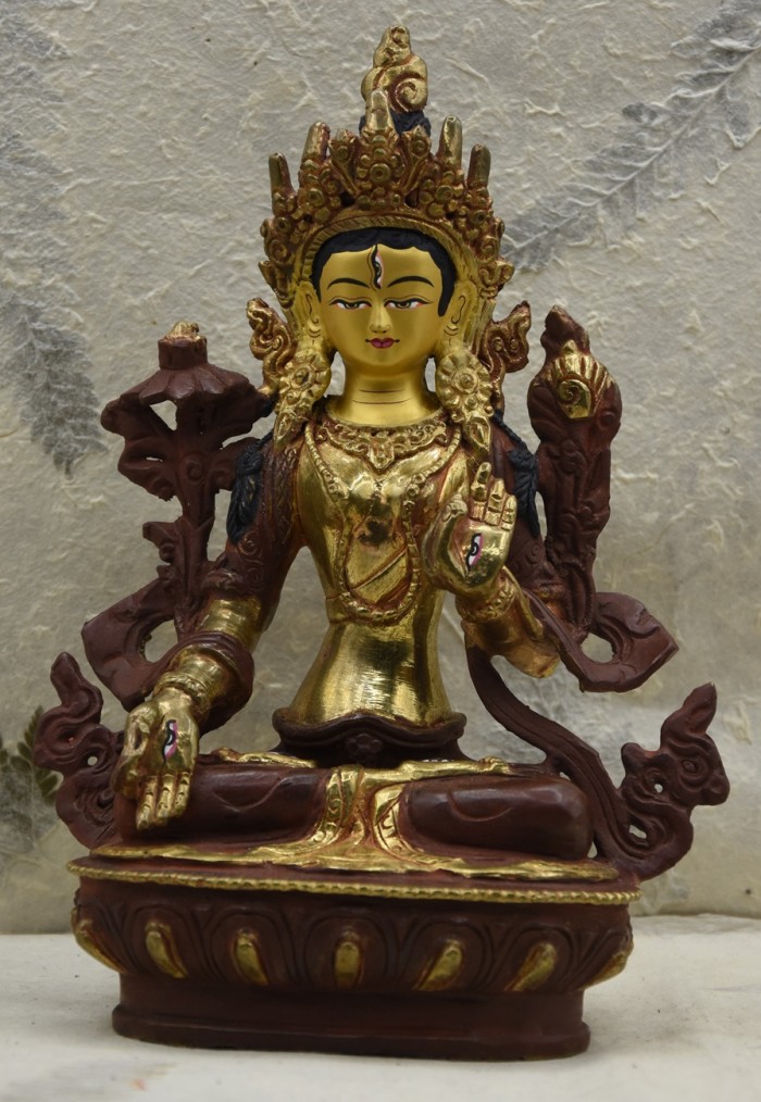Crafted through traditional lost-wax casting with genuine stone inlays for her eyes and sacred symbols, plus intricate hand-painting and detailed gold finishing, this statue radiates profound spiritual power and Himalayan artistry.