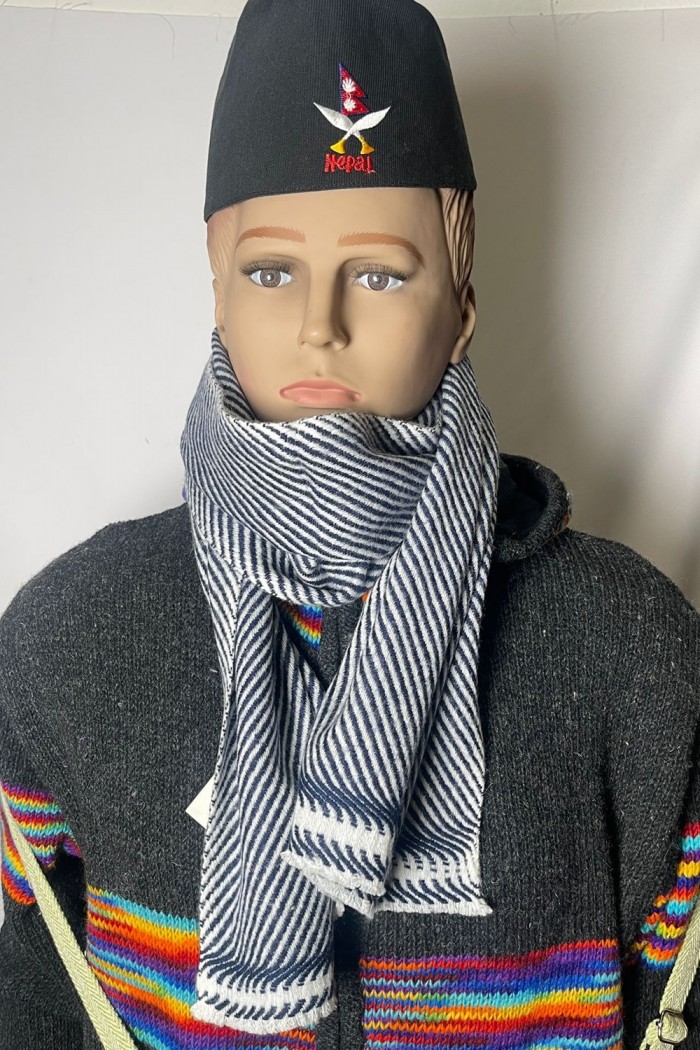 Discover refined sophistication with this exclusive navy and white striped cashmere scarf, handcrafted by skilled artisans in Nepal using premium pure cashmere. The striking diagonal stripes in deep navy blue and bright white create a versatile herringbone pattern that adds depth and character, making it a standout accessory for any season.