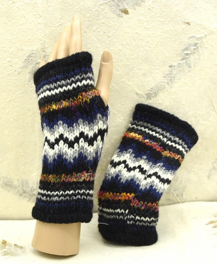 Elevate your winter wardrobe with these charming convertible fingerless gloves hand-knitted from soft, insulating wool in a deep navy blue hue. The intricate fair isle pattern incorporates classic white and gray zigzags, bold black contrasts, and playful rainbow multi-color yarn threads that add pops of pink, orange, yellow, and green – creating a vibrant, traditional yet modern Nordic-inspired look.